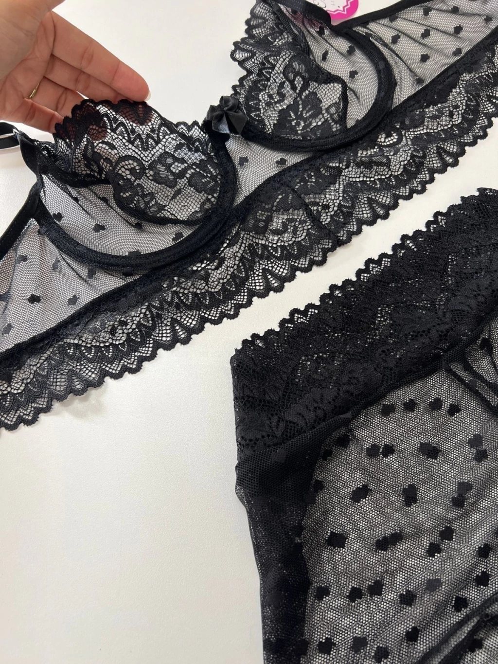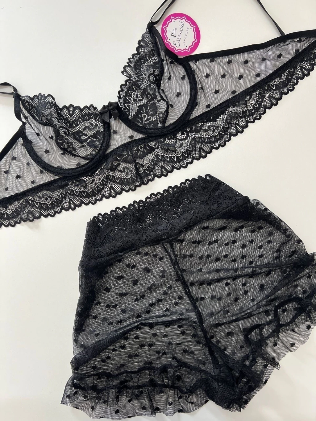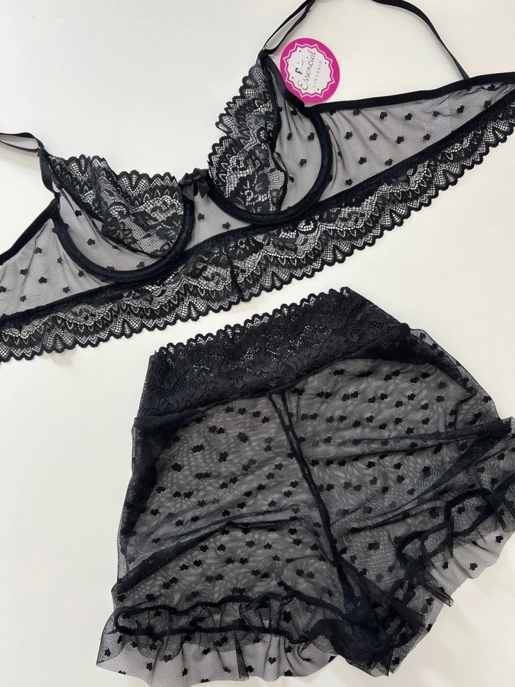O que você recebe: - Top em tule transparente com detalhes delicados - Short doll de cintura alta, que modela e valoriza o corpo